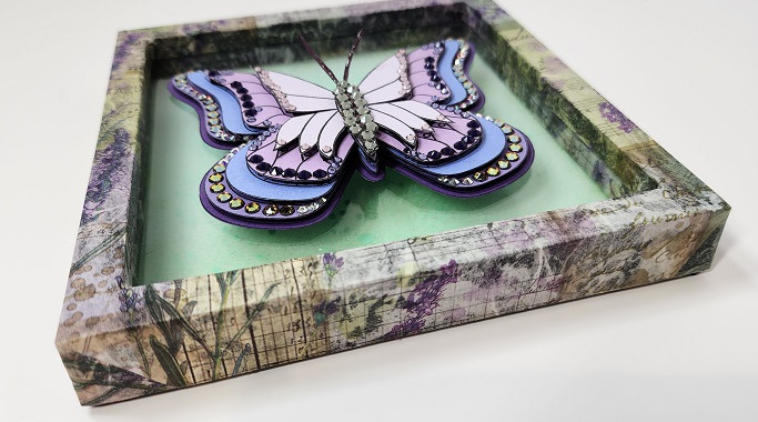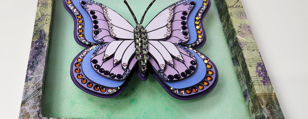Layered butterfly adorned with sparkling rhinestones on a glass frame wrapped in your choice of rice paper.